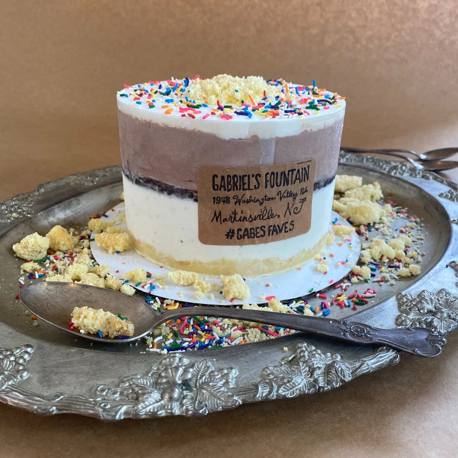 A naked yellow cake featuring Madagascar Vanilla and Milk Chocolate ice cream with house made chocolate ganache & cookie crunch center. Starring a dollop of vanilla frosting, yellow cake crumble & rainbow sprinkles on top.